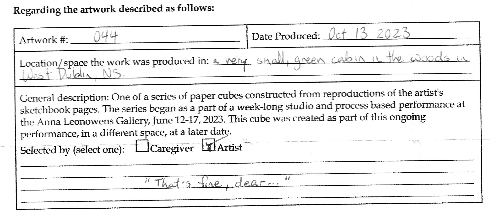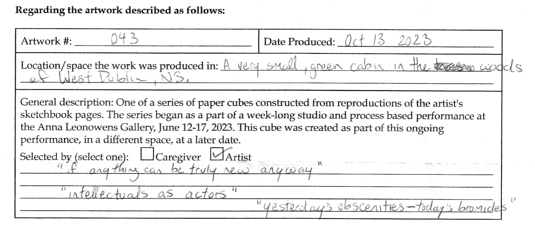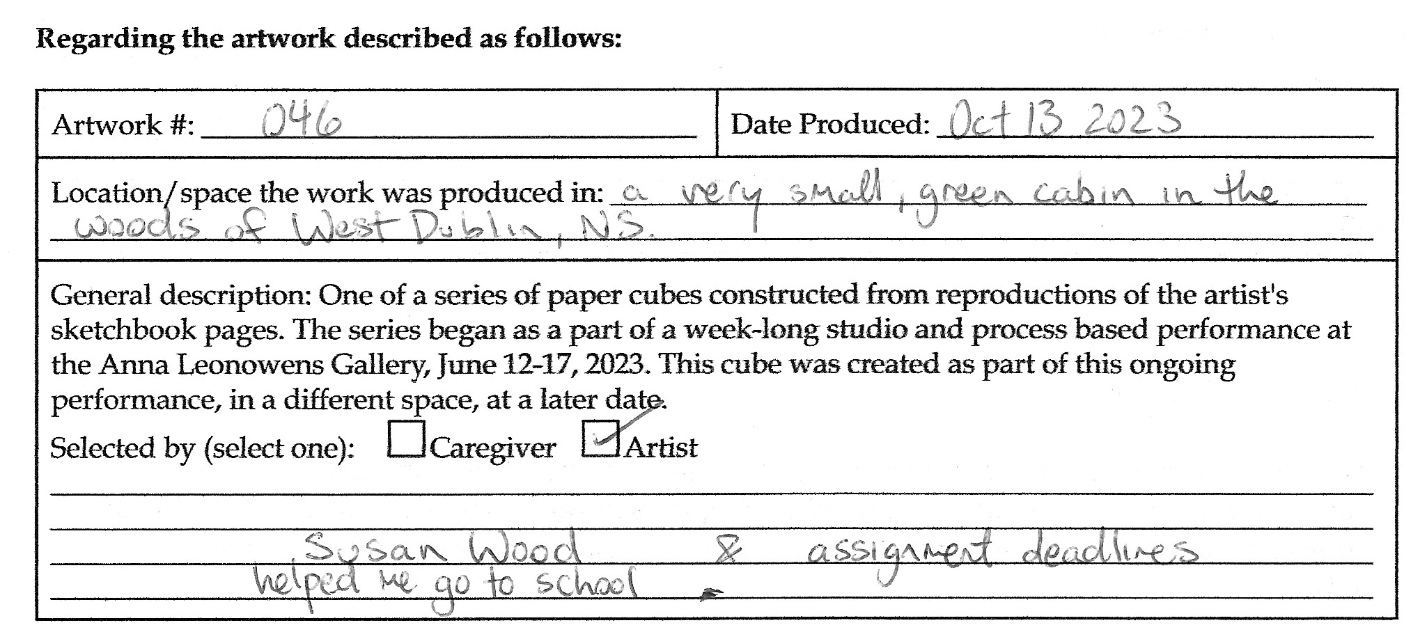 Created in West Dublin, Nova Scotia, and later scanned in LaHave, Nova Scotia, during the Fall of 2023 following the exhibition A Room of One’s Own // Rent Free