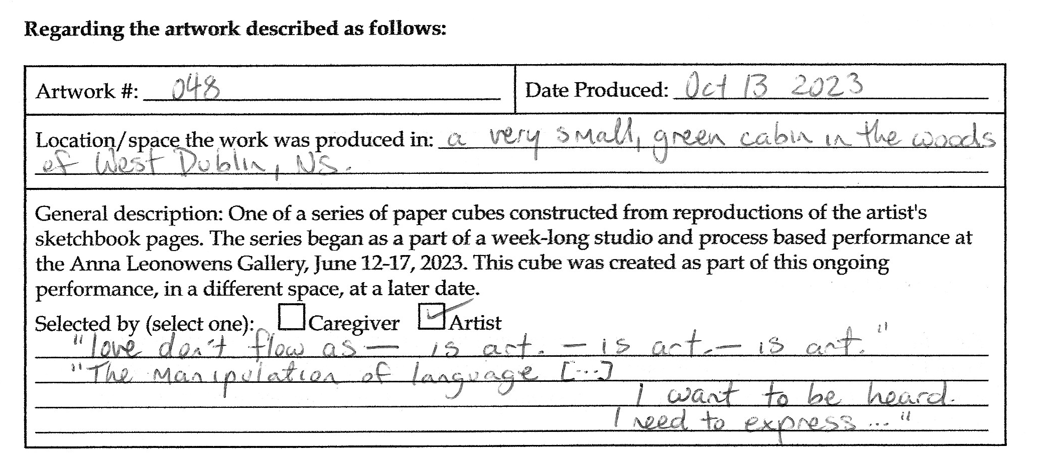 Created during a week-long exhibition of A Room of One’s Own // Rent Free at the Anna Leonowens Gallery in Halifax, NS.