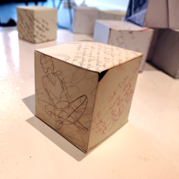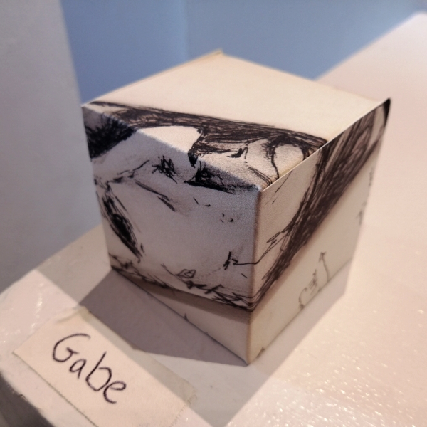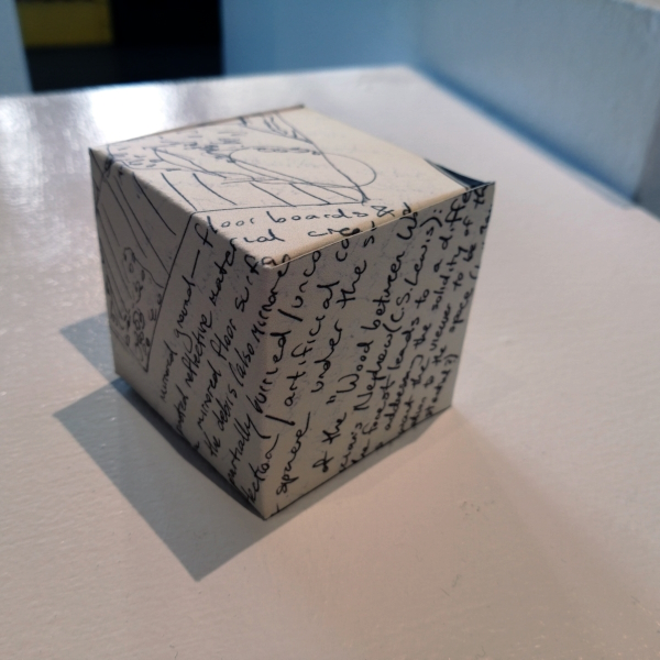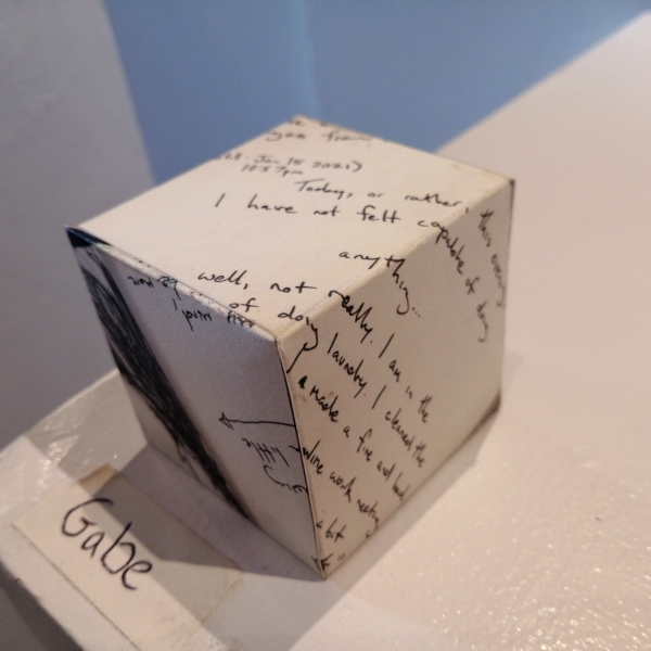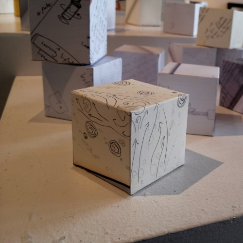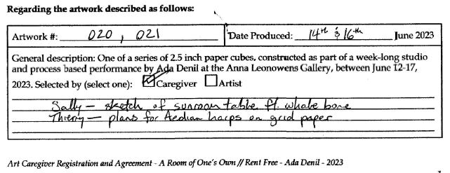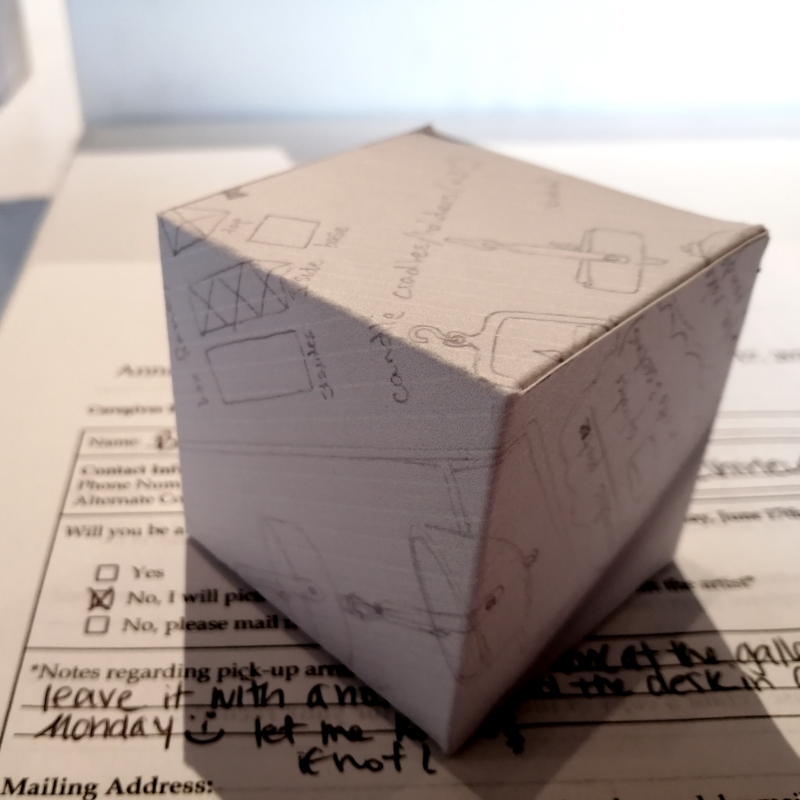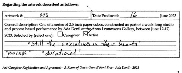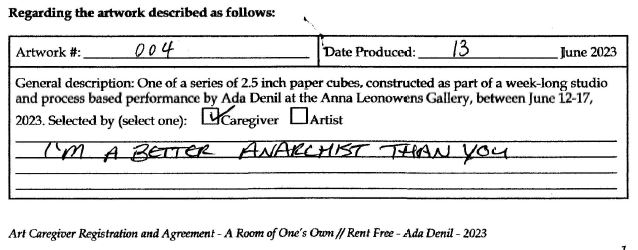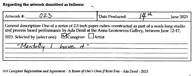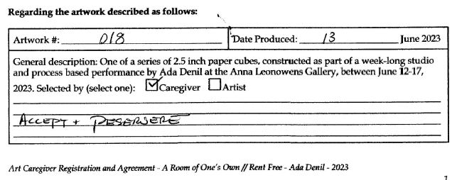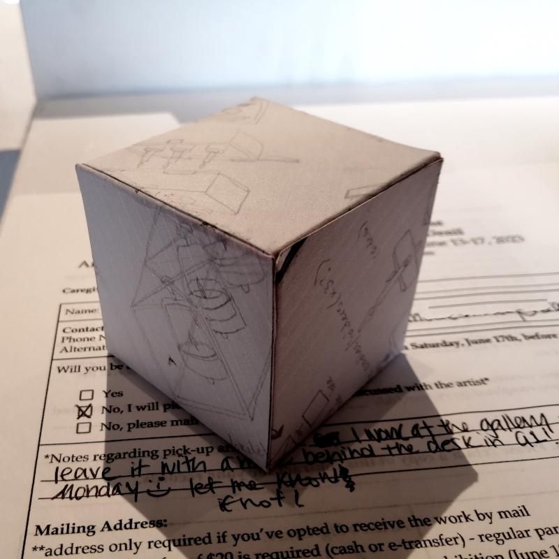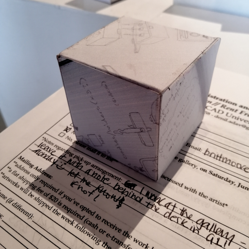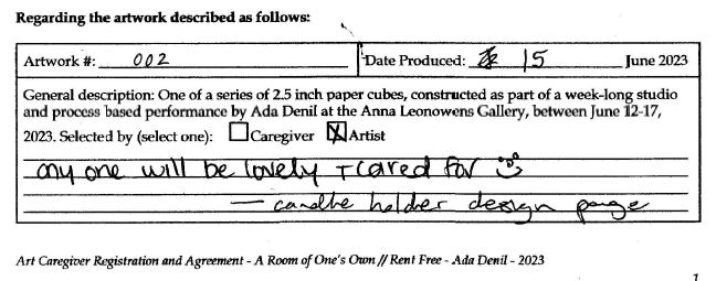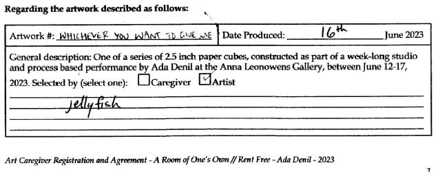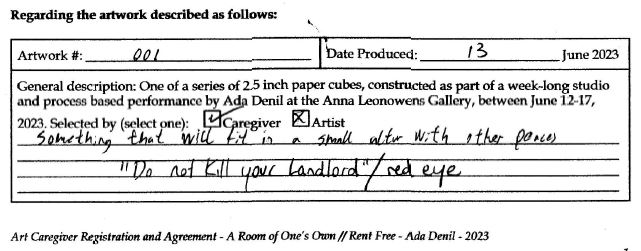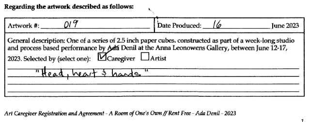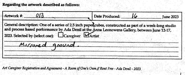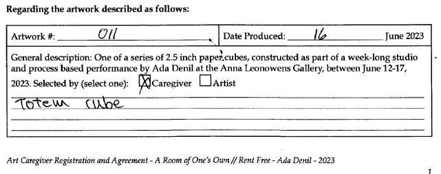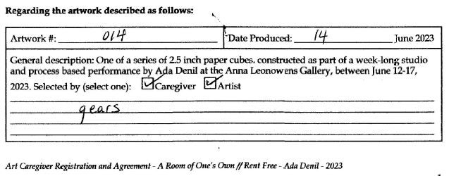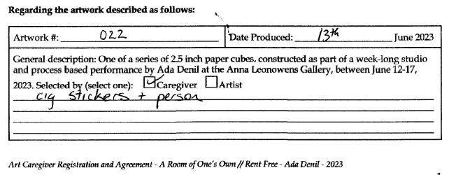 Background: In 2023 I had a solo show at the Anna Leonowens Gallery, marking the end of my time at NSCAD. “A Room of One’s Own // Rent Free” was a week-long open-studio performance reflecting on process, production and space. During this performance, I began work on the series titled “Rent Free” , a series of folded paper cubes (scanned and printed copies of the pages of my sketchbooks filled over the 6 years I was enrolled at NSCAD). The cubes I created during the show were, as they were made, put up for adoption. Visitors to the gallery were asked to sign an Art Caregiver’s Agreement in order to adopt a single cube. Each Caregiver has been given a profile on this website, with information regarding the specific cube they adopted, as well as documentation of the cube in the space it now lives.