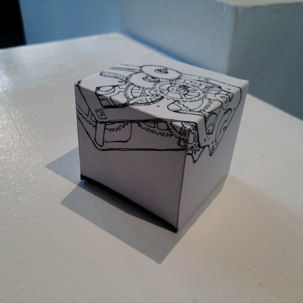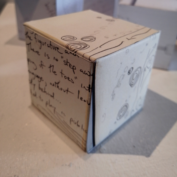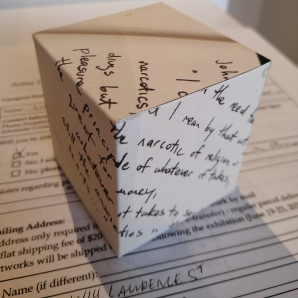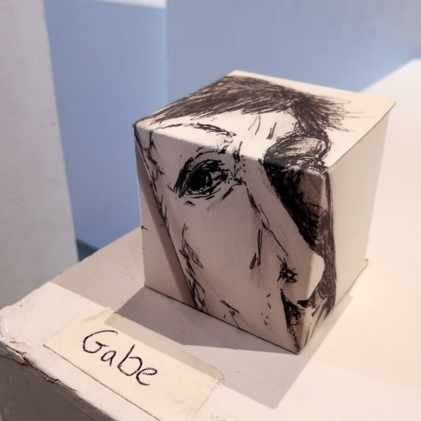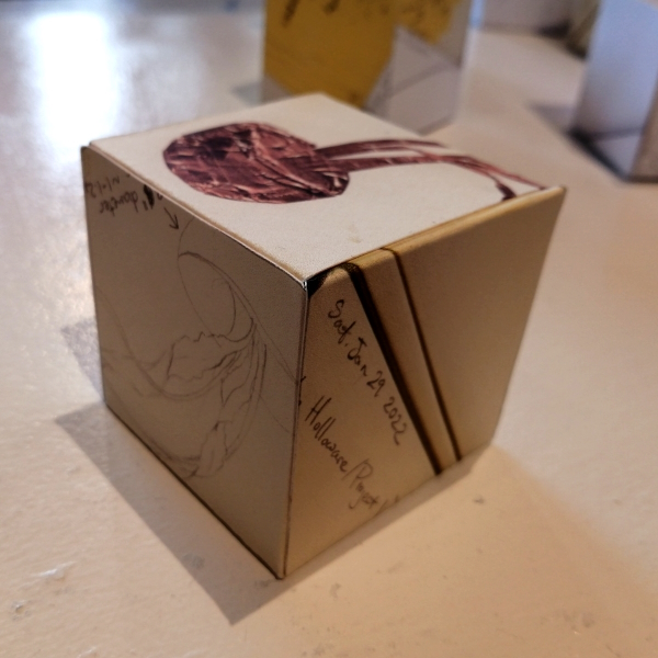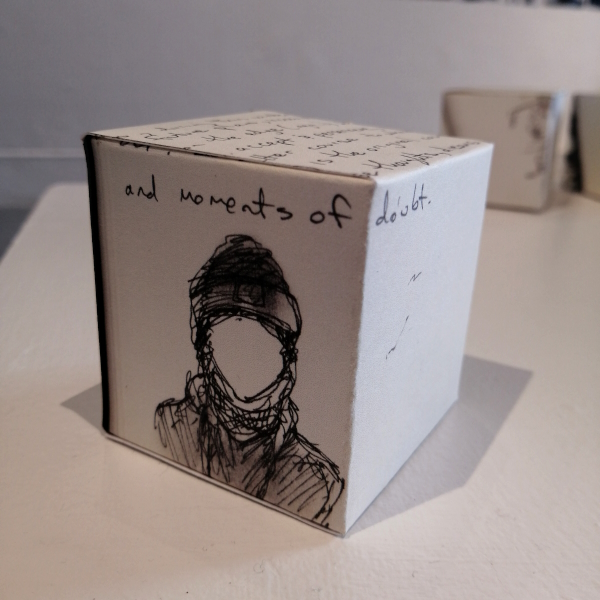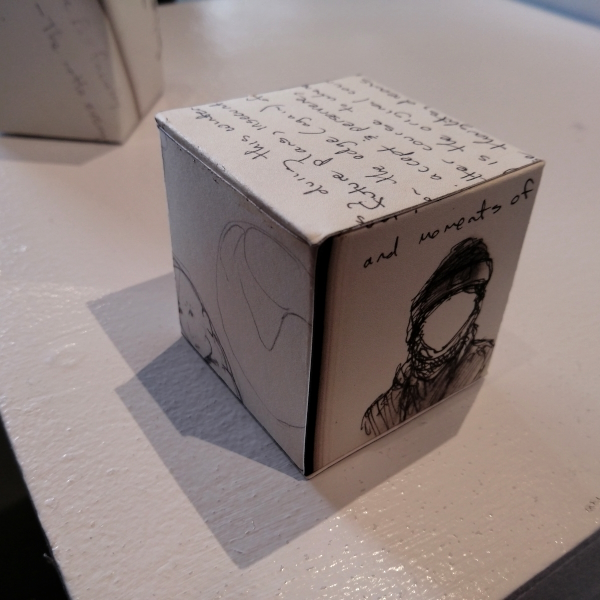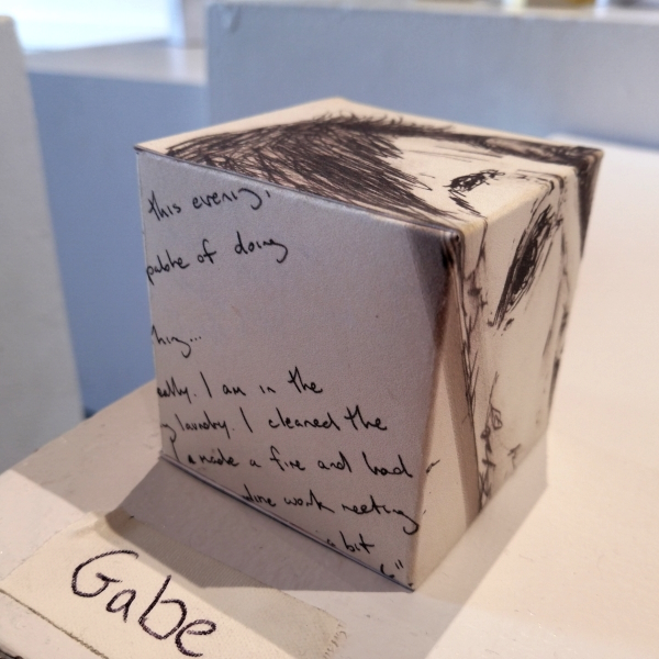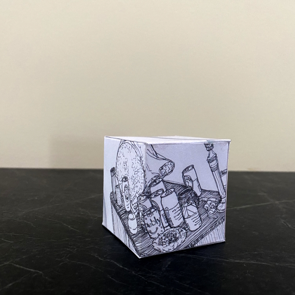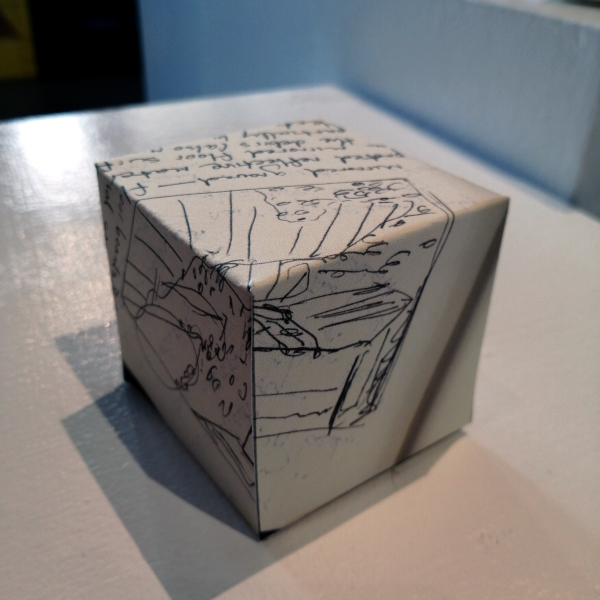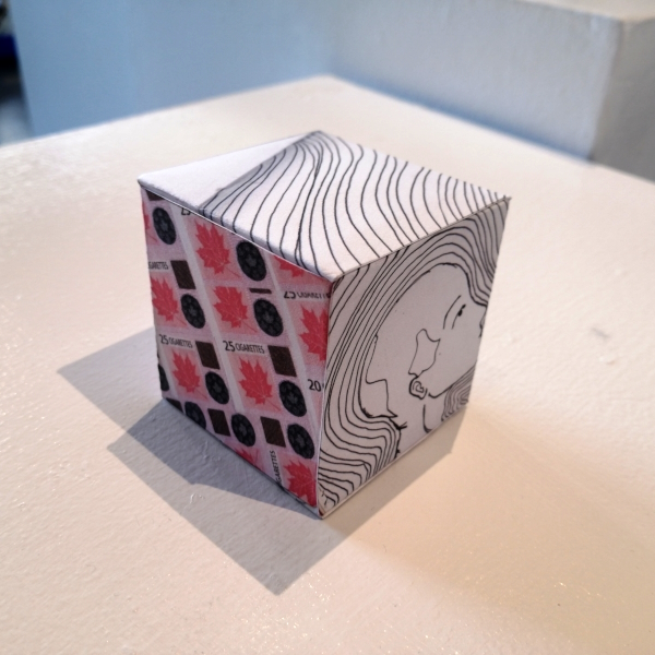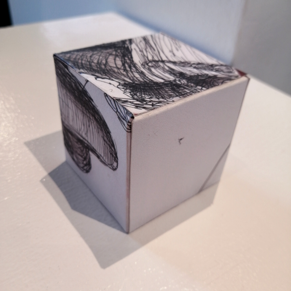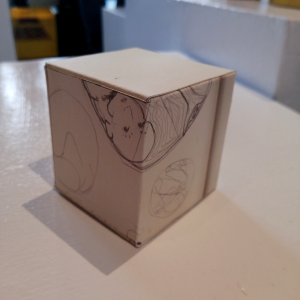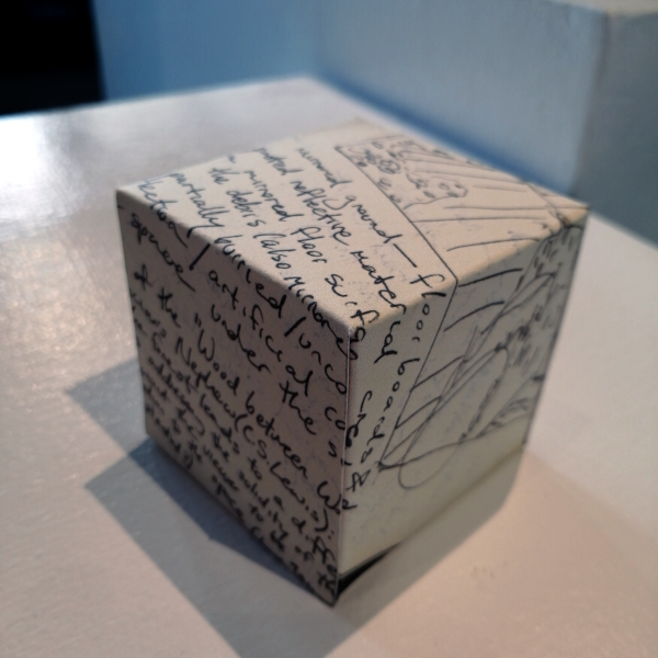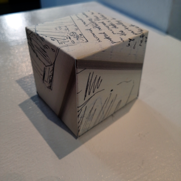 Background: In 2023 I had a solo show at the Anna Leonowens Gallery, marking the end of my time at NSCAD. “A Room of One’s Own // Rent Free” was a week-long open-studio performance reflecting on process, production and space. During this performance, I began work on the series titled “Rent Free” , a series of folded paper cubes (scanned and printed copies of the pages of my sketchbooks filled over the 6 years I was enrolled at NSCAD). The cubes I created during the show were, as they were made, put up for adoption. Visitors to the gallery were asked to sign an Art Caregiver’s Agreement in order to adopt a single cube. Each Caregiver has been given a profile on this website, with information regarding the specific cube they adopted, as well as documentation of the cube in the space it now lives.