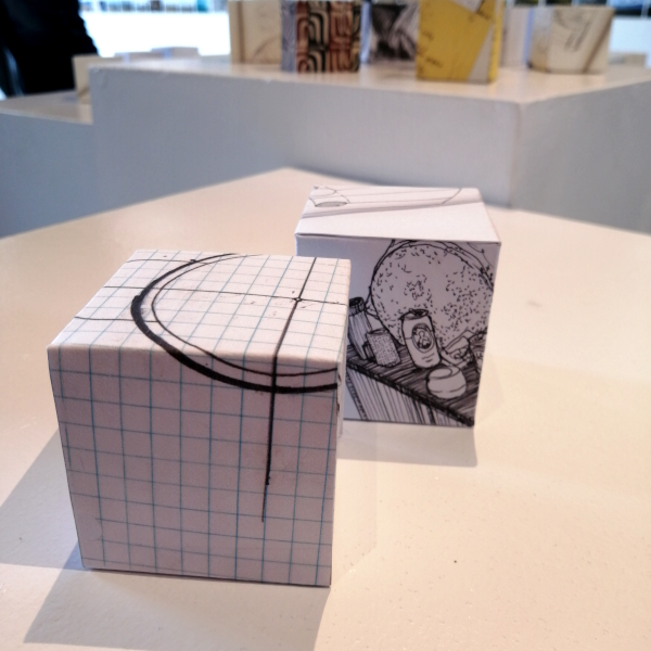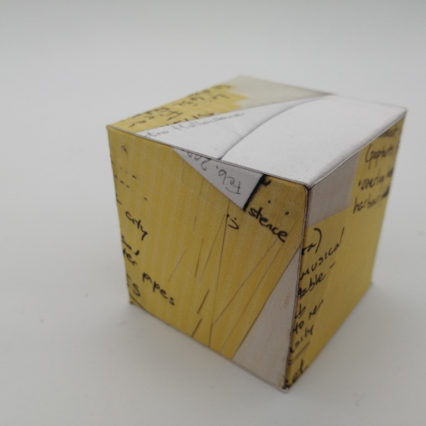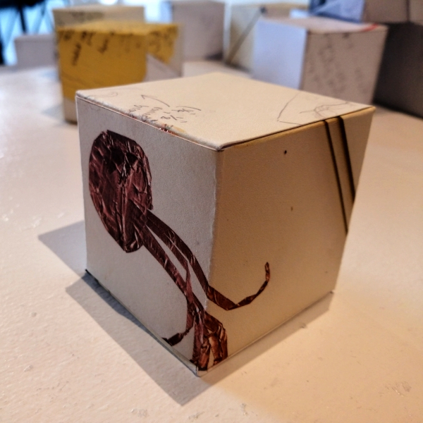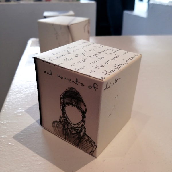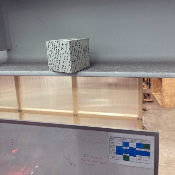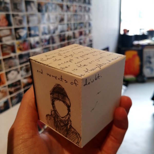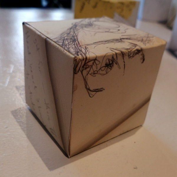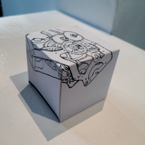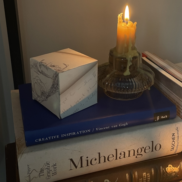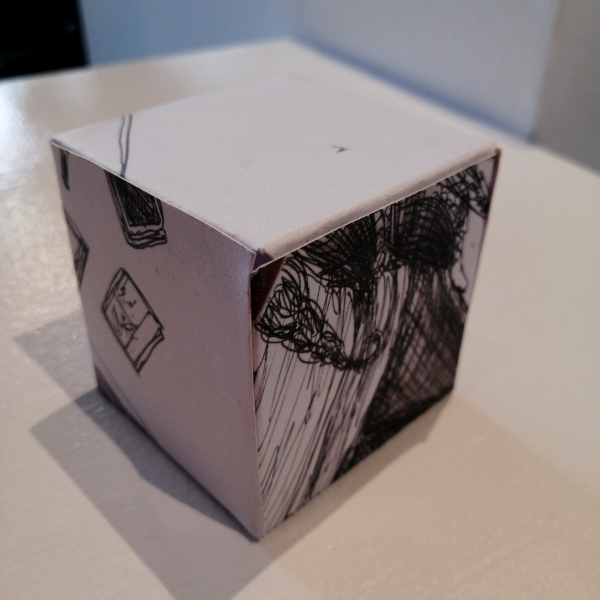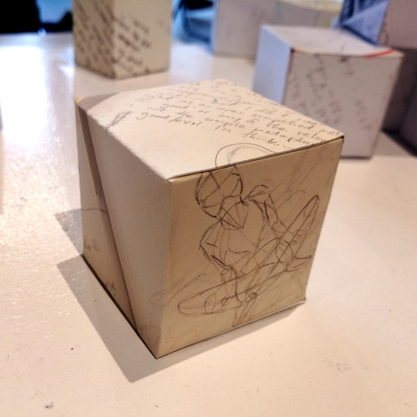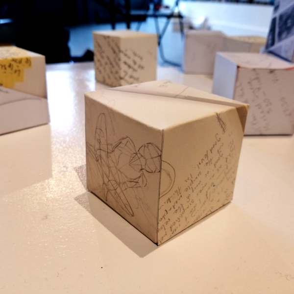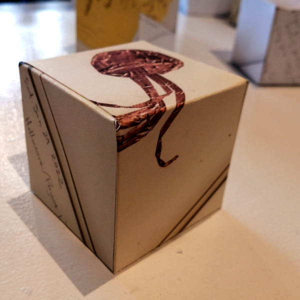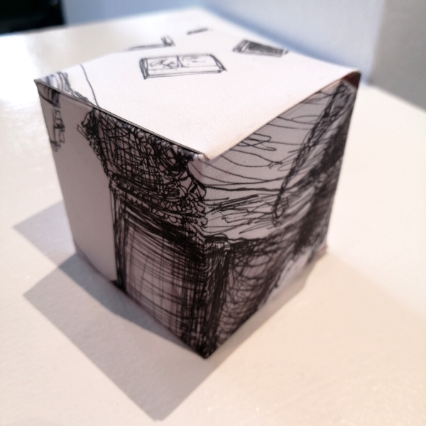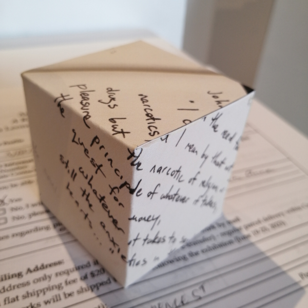 Background: In 2023 I had a solo show at the Anna Leonowens Gallery, marking the end of my time at NSCAD. “A Room of One’s Own // Rent Free” was a week-long open-studio performance reflecting on process, production and space. During this performance, I began work on the series titled “Rent Free” , a series of folded paper cubes (scanned and printed copies of the pages of my sketchbooks filled over the 6 years I was enrolled at NSCAD). The cubes I created during the show were, as they were made, put up for adoption. Visitors to the gallery were asked to sign an Art Caregiver’s Agreement in order to adopt a single cube. Each Caregiver has been given a profile on this website, with information regarding the specific cube they adopted, as well as documentation of the cube in the space it now lives.