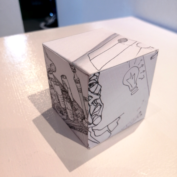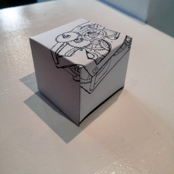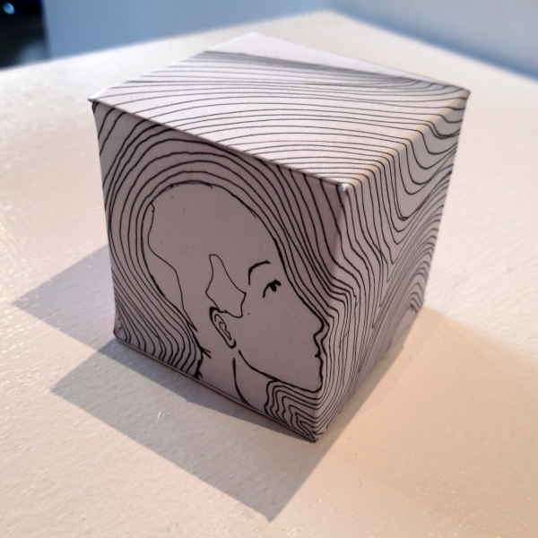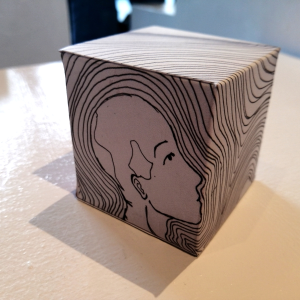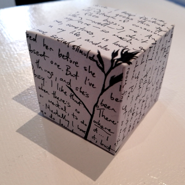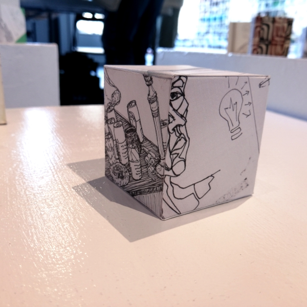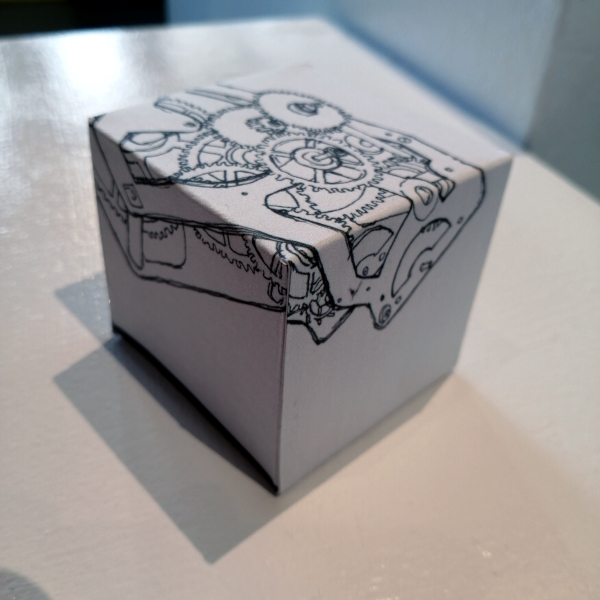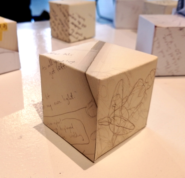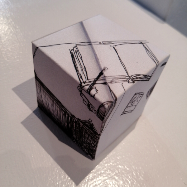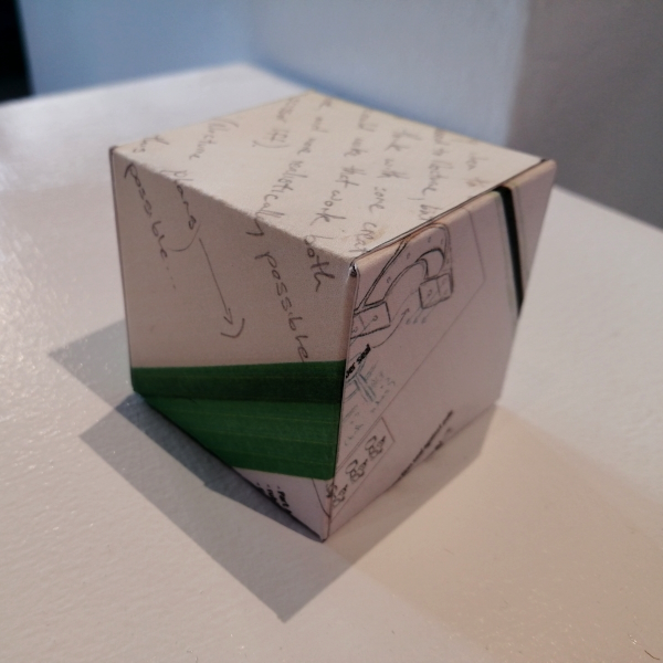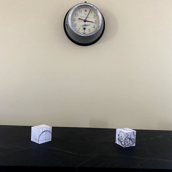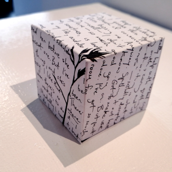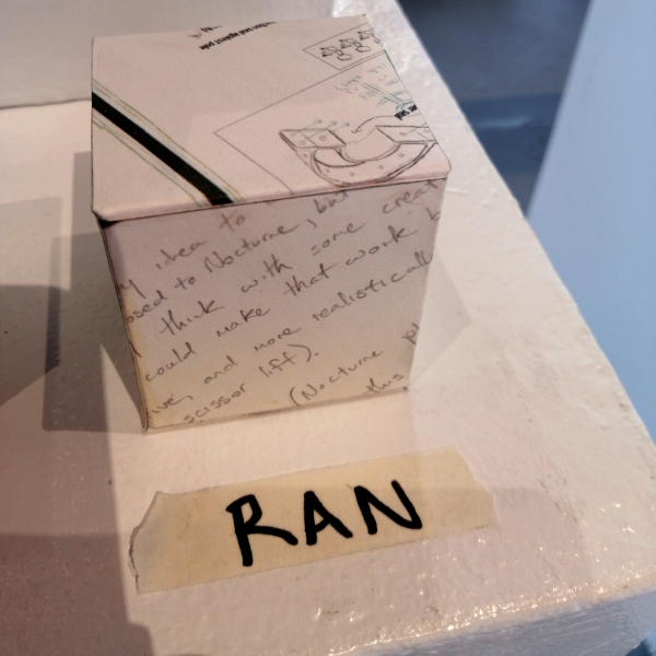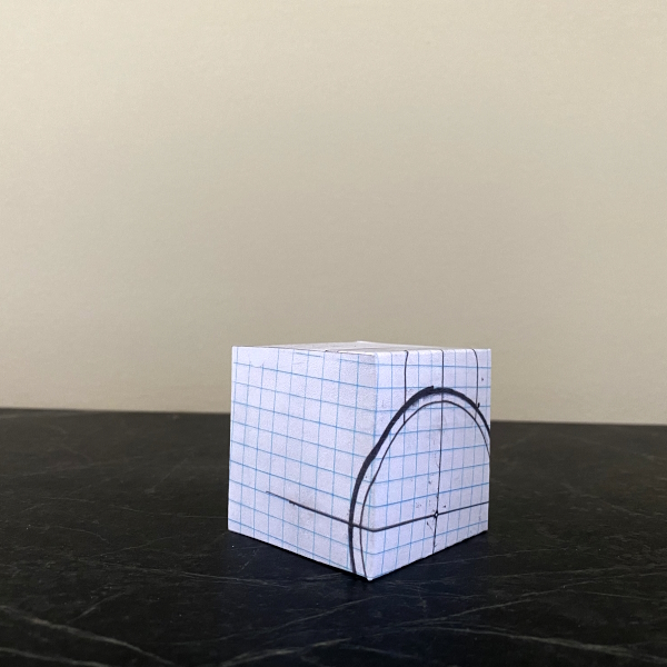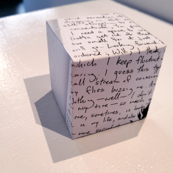 Background: In 2023 I had a solo show at the Anna Leonowens Gallery, marking the end of my time at NSCAD. “A Room of One’s Own // Rent Free” was a week-long open-studio performance reflecting on process, production and space. During this performance, I began work on the series titled “Rent Free” , a series of folded paper cubes (scanned and printed copies of the pages of my sketchbooks filled over the 6 years I was enrolled at NSCAD). The cubes I created during the show were, as they were made, put up for adoption. Visitors to the gallery were asked to sign an Art Caregiver’s Agreement in order to adopt a single cube. Each Caregiver has been given a profile on this website, with information regarding the specific cube they adopted, as well as documentation of the cube in the space it now lives.