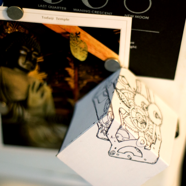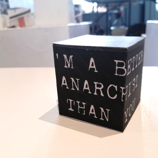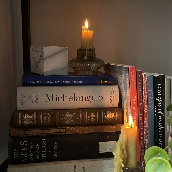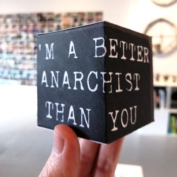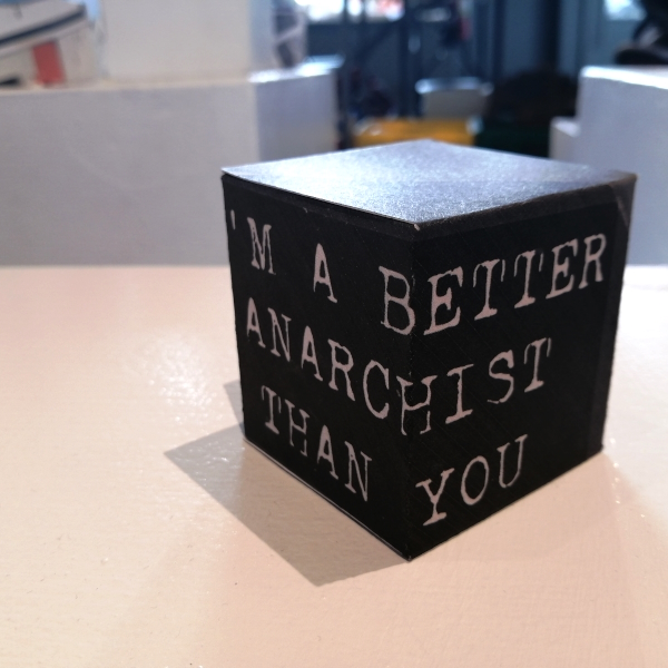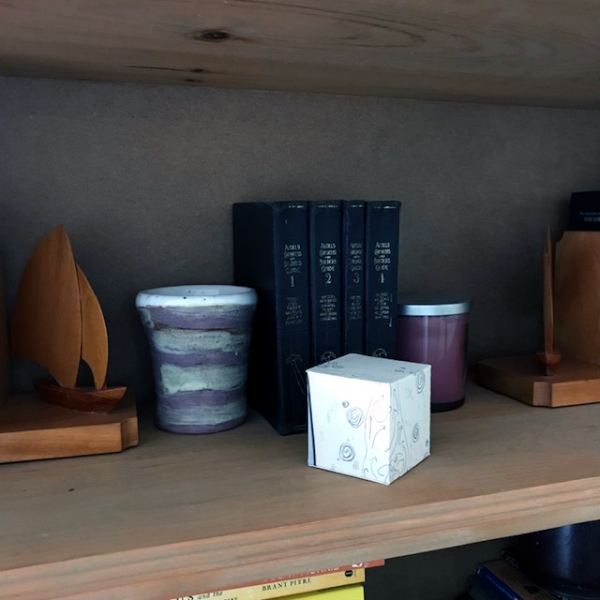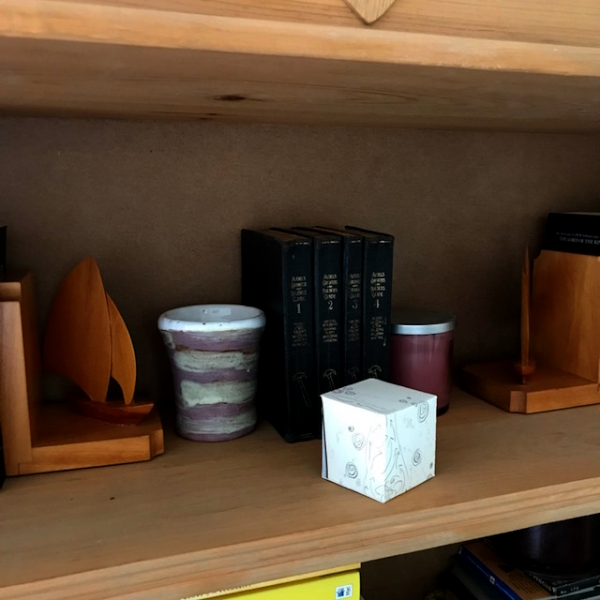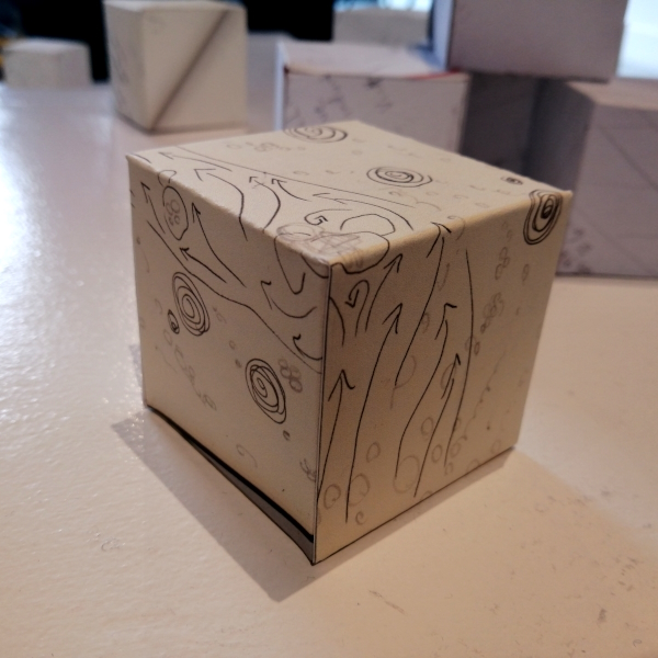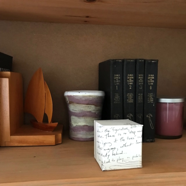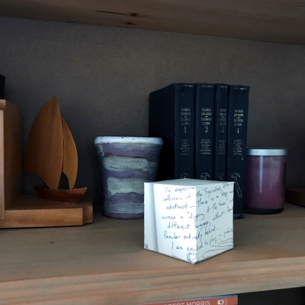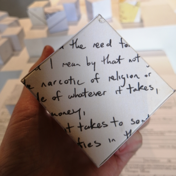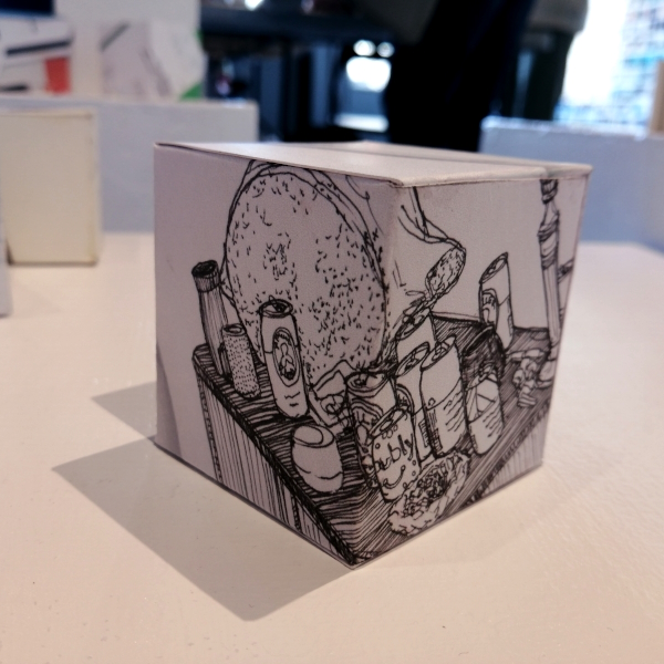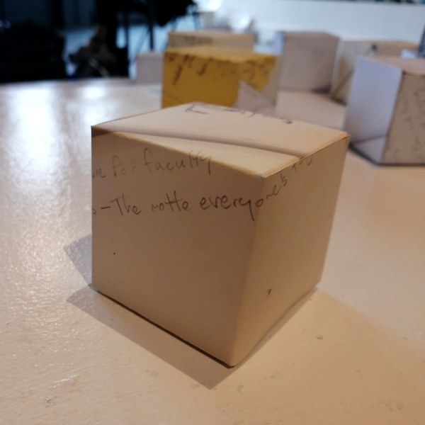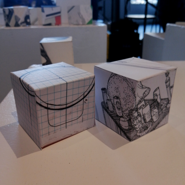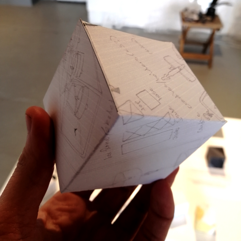 Background: In 2023 I had a solo show at the Anna Leonowens Gallery, marking the end of my time at NSCAD. “A Room of One’s Own // Rent Free” was a week-long open-studio performance reflecting on process, production and space. During this performance, I began work on the series titled “Rent Free” , a series of folded paper cubes (scanned and printed copies of the pages of my sketchbooks filled over the 6 years I was enrolled at NSCAD). The cubes I created during the show were, as they were made, put up for adoption. Visitors to the gallery were asked to sign an Art Caregiver’s Agreement in order to adopt a single cube. Each Caregiver has been given a profile on this website, with information regarding the specific cube they adopted, as well as documentation of the cube in the space it now lives.