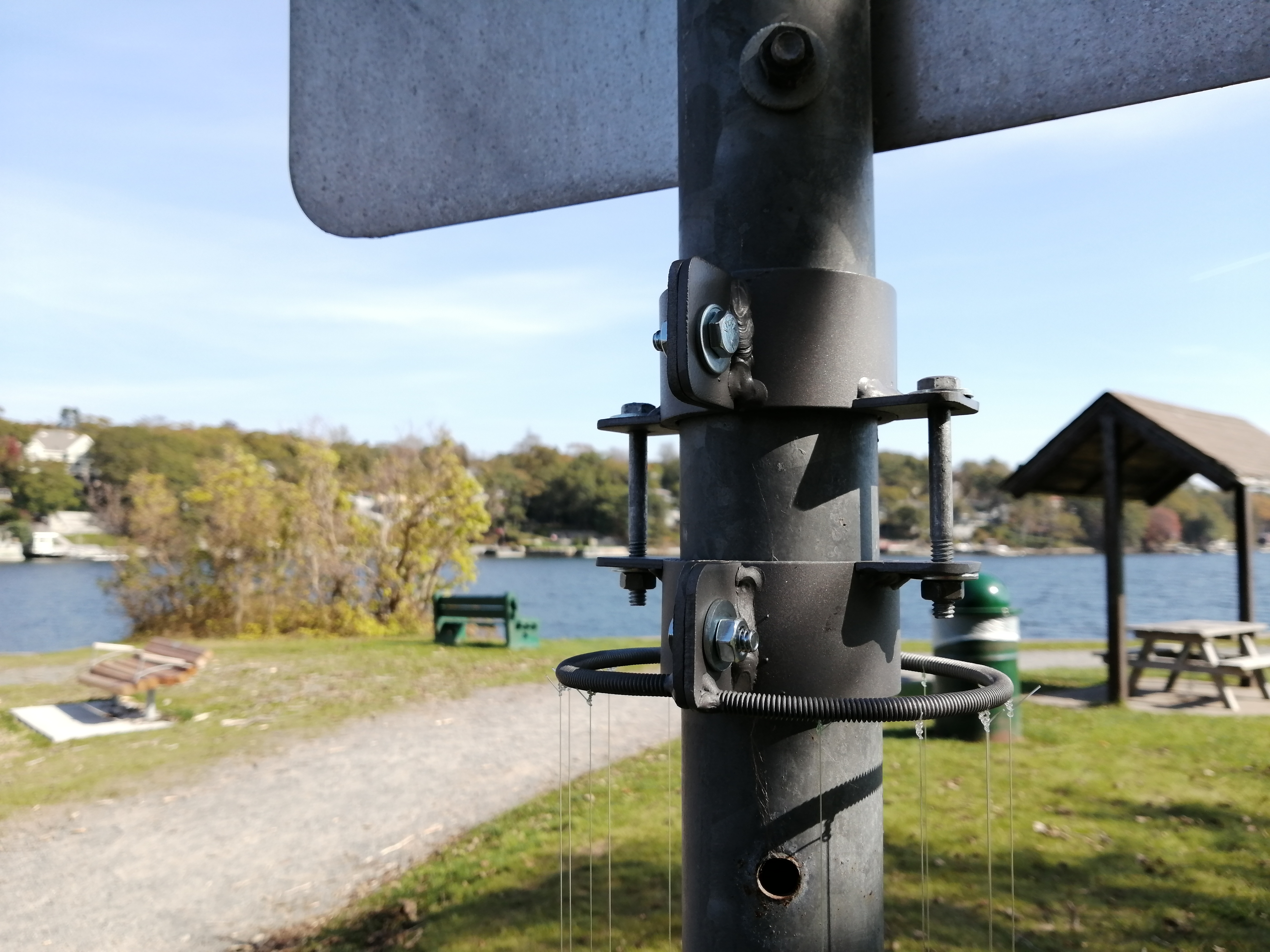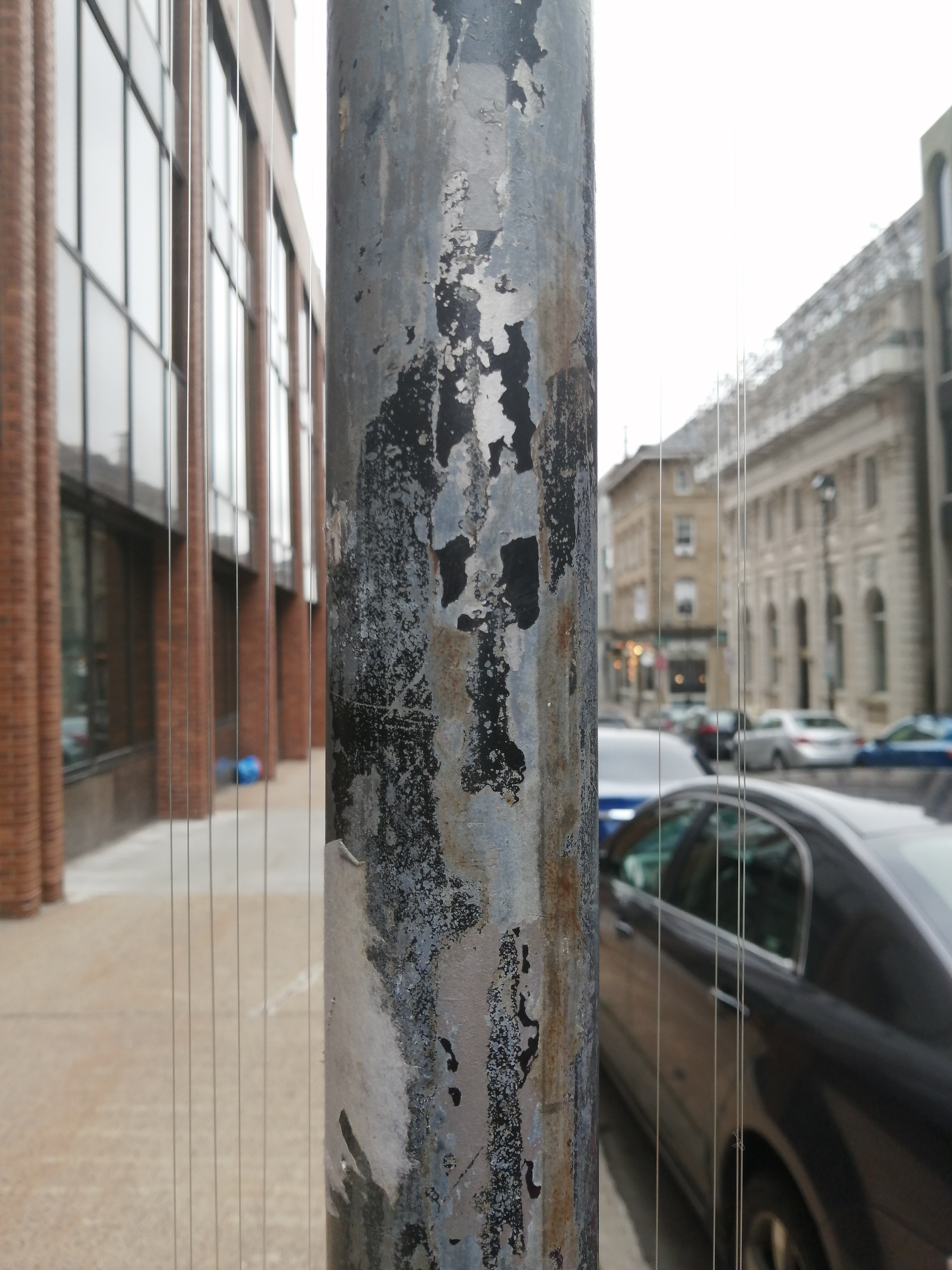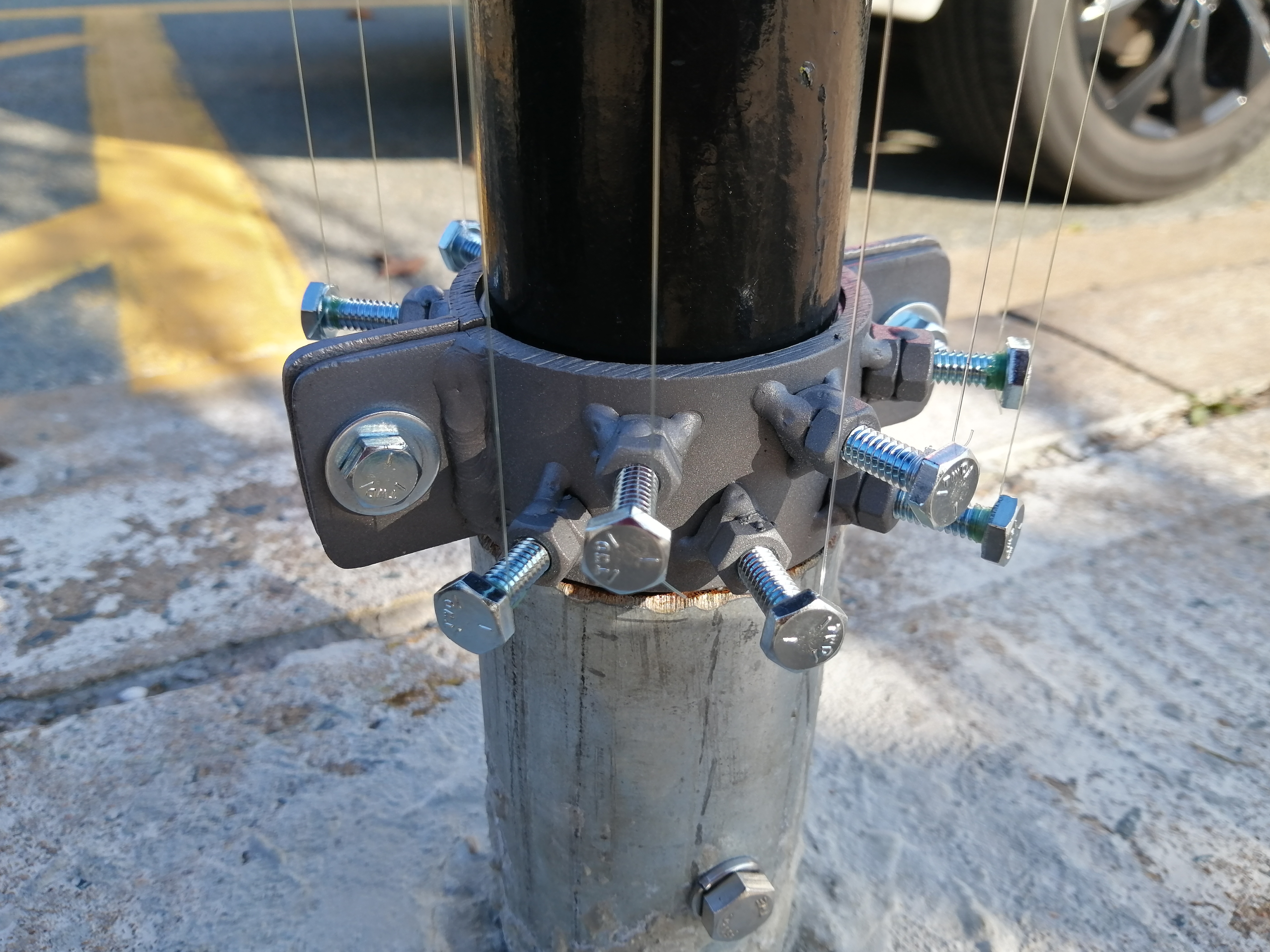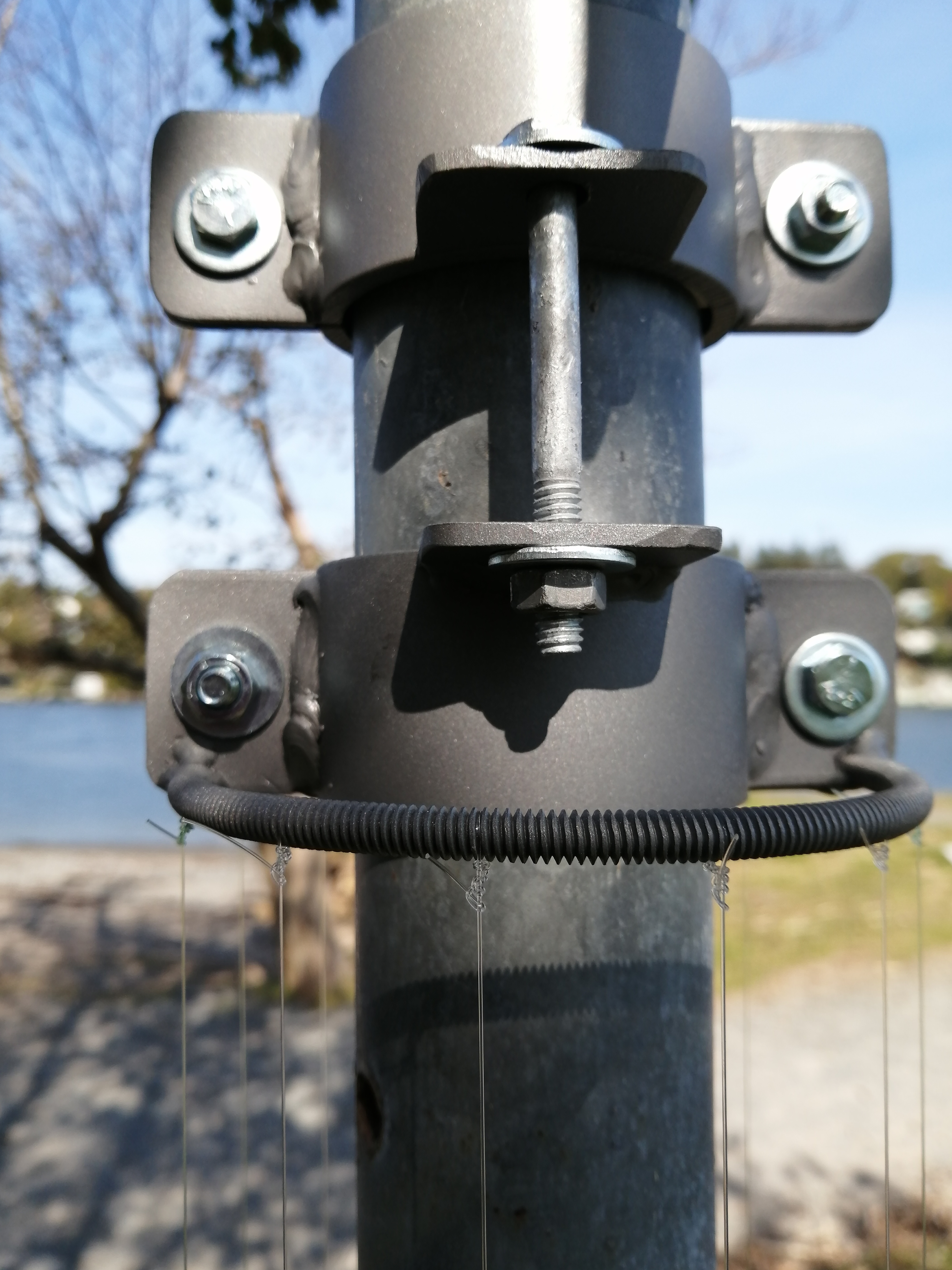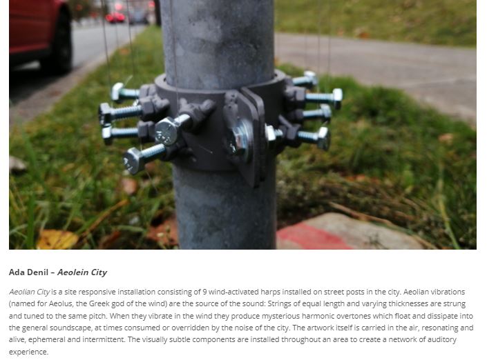 Aeolian vibrations (named for Aeolus, the Greek god of the wind) are the source of the sound: Strings of equal length and varying thicknesses are strung and tuned to the same pitch. When they vibrate in the wind they produce mysterious harmonic overtones which float and dissipate into the general soundscape, at times consumed or overridden by the noise of the city. The artwork itself is carried in the air, resonating and alive, ephemeral and intermittent.